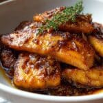 The image shows a white bowl filled with several pieces of golden-brown fried fish, covered in a thick, glossy sauce that has visible small bits of caramelized onion or garlic. The fish pieces are arranged in layers, with some pieces overlapping. On top of the fish, there is a small sprig of green herbs, likely thyme, adding a touch of color contrast. The sauce looks rich and sticky, giving the fish a shiny appearance. The background includes a white marbled texture and a blurred glimpse of a brown surface, adding warmth to the setting. photo taken with an iphone --ar 4:5 --v 7
