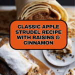 Keywords: Apple strudel, strudel dough, spiced apple dessert, baked pastry, cinnamon apple dessert, raisin filling