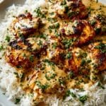 - Serve: Spoon the cooked rice onto plates, place the smothered chicken thighs on top, and ladle the creamy gravy over everything. Garnish with freshly chopped parsley before serving.