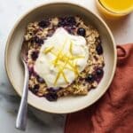 Blueberry Lemon Baked Oatmeal is a wholesome and comforting breakfast dish featuring old fashioned rolled oats infused with fresh lemon zest and juice, studded with juicy blueberries, and lightly sweetened with maple syrup. This baked oatmeal is enhanced with poppy seeds and a blend of plant-based milk and yogurt, making it creamy and naturally flavorful. Perfect for a warm, nutritious start to the day, it’s easy to prepare and can be topped with extra fresh blueberries, lemon zest, yogurt, or more maple syrup.