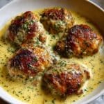 This Bobby Flay Chicken Thighs recipe features crispy skin-on chicken thighs cooked to golden perfection and served in a rich, creamy garlic sauce. The sauce is made with butter, garlic, heavy cream, chicken broth, Dijon mustard, and a splash of lemon juice, creating a flavorful combination enhanced by fresh parsley. It’s an ideal dinner dish that delivers comfort and elegance with simple ingredients and straightforward cooking techniques.