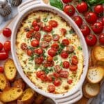 This creamy and cheesy Caprese Dip combines roasted cherry tomatoes, fresh basil, and a trio of mozzarella, provolone, and parmesan cheeses for a deliciously melty appetizer. Perfect for serving with crusty bread, crackers, or tortilla chips, this baked dip brings the classic flavors of a Caprese salad in a warm, indulgent dish.