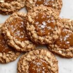 These caramel oatmeal cookies combine chewy oats with rich toffee bits and a gooey caramel center for a perfect balance of textures and flavors. Topped with a hint of flaked salt, they deliver a delightful sweet and salty treat that’s sure to satisfy any cookie lover.