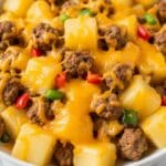 - Step 3: In a large bowl, combine the cooked ground beef, frozen cubed potatoes with onions and peppers, both cans of soup, and half of the shredded cheddar cheese. Add any extra seasoning carefully, considering the salt in the soups.