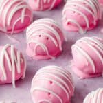 - Drizzle Almond Bark: Using a spoon or candy dipper, drizzle thin ribbons of melted white almond bark artistically over the pink-coated cheesecake bites.