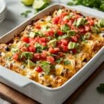 This Chicken Taco Casserole is a hearty, flavorful baked dish combining tender cooked chicken, black beans, diced tomatoes, fresh vegetables, and a blend of taco seasoning and cheese. Topped with melted cheddar and fresh garnishes like avocado, jalapeños, and tortilla chips, it’s an easy, crowd-pleasing meal perfect for weeknights or casual gatherings.