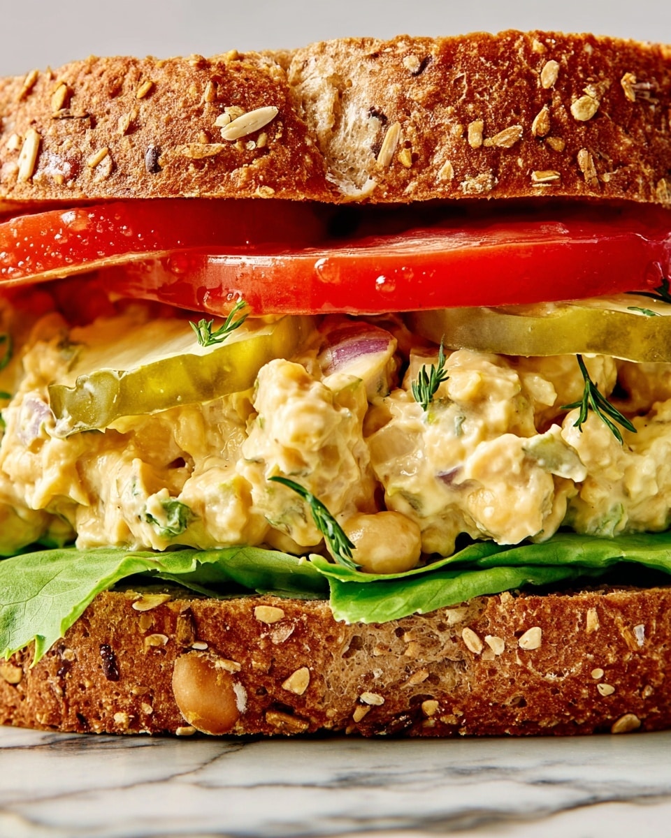 - Assemble the sandwiches: Layer the chickpea salad on slices of bread. Top with butter lettuce leaves, sliced pickles, and fresh sliced tomatoes for a crunchy, tangy finish. Serve immediately or chill before serving.