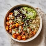 - Build Your Bowls: Just before serving, fold the diced avocado gently into the black bean salsa to keep the avocado pieces intact. Divide the cooked quinoa or brown rice evenly among five bowls. Top each bowl with a generous portion of the smoky roasted sweet potatoes and the chili-lime black bean salsa. Drizzle the spicy yogurt sauce over each bowl and finish with a sprinkle of toasted, unsalted pumpkin seeds for a delightful crunch.