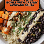 Keywords: sweet potato bowl, black bean salsa, vegan bowl, chili-lime, roasted sweet potatoes, plant-based meal, healthy bowls, quinoa bowl, spicy yogurt drizzle