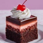 9. Cut and Serve: Remove the cake from the freezer. Using a warm knife (dip in warm water and dry between cuts), cut the cake into neat squares. Garnish each piece with a fresh or maraschino cherry. Serve optionally with whipped cream.