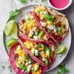 Enjoy a vibrant and nutritious start to your day with these colorful breakfast tacos featuring naturally pink corn tortillas made from masa harina and beetroot juice. Packed with fluffy scrambled eggs, creamy avocado, tangy feta cheese, and fresh vegetable salsa, this recipe offers a delightful combination of flavors and textures perfect for breakfast or brunch.