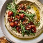 A vibrant and hearty Mediterranean-inspired dish featuring crispy roasted cannellini beans and juicy oven-roasted tomatoes served over a creamy, tangy tahini coconut yogurt. Enhanced with fresh baby arugula and bright lemon notes, this recipe balances rich textures and flavors, perfect for a satisfying vegetarian meal or appetizer accompanied by crusty bread or pita.