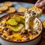 This Crockpot Big Mac Dip is a creamy, cheesy appetizer inspired by the iconic flavors of the Big Mac burger. Combining seasoned ground beef with melted cheddar and Velveeta cheeses, tangy pickles, and a zesty sauce made from mayo, ketchup, mustard, and pickle juice, this dip is perfect for parties or game days. Slow-cooked in a crockpot to achieve a warm, gooey texture, it’s easy to prepare and irresistible to serve with chips or veggies.