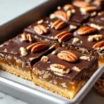 Decadent Turtle Bars are a rich, multi-layered dessert featuring a buttery shortbread crust, gooey caramel studded with toasted pecans, and a luscious chocolate topping. Perfectly sweet with a hint of sea salt to balance the flavors, these bars make a delightful treat for any occasion.