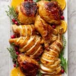 A white rectangular plate holds a beautifully arranged roasted chicken cut into several layers, with two large pieces of crispy, golden-brown chicken thighs and two drumsticks with shiny, glazed skin placed on top and between the slices. The chicken slices have a light brown crust with a juicy white inside, fanned out on each side of the plate. Around the chicken are bright orange slices, dark red cranberries, and fresh green sprigs of rosemary and thyme, adding a vibrant color contrast to the warm tones of the chicken. The plate rests on a white marbled surface, enhancing the fresh and clean presentation of the dish. Photo taken with an iphone --ar 4:5 --v 7