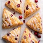 The image shows six triangular scones arranged in a circle on white parchment paper, placed on a white marbled surface. Each scone has a golden brown crust with visible flaky layers and contains bright red cranberries scattered inside. A light drizzle of pale pink glaze runs in thin lines across the top of each scone, adding a slight shine and contrast. Some cranberry halves are visible on top and around the scones. photo taken with an iphone --ar 4:5 --v 7