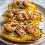 Store leftover scampi boats wrapped tightly in foil in the refrigerator for up to 3 days. Reheat in a 350°F oven until warmed through to maintain the squash’s texture and keep the shrimp tender. Avoid microwaving to prevent the shrimp from overcooking and becoming rubbery.