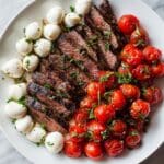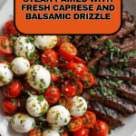 This Grilled Flank Steak Caprese with Balsamic Dressing is a fresh and flavorful dish combining tender, marinated flank steak with a classic Caprese salad of cherry tomatoes, fresh mozzarella, and basil. Finished with a rich balsamic glaze, it’s perfect for a quick summer grill or an elegant weeknight dinner.