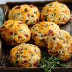 6. Add Topping: Sprinkle the reserved ½ cup of cheddar cheese evenly over the tops of the biscuits.