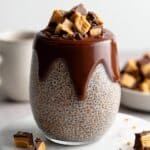 A clear glass shows a two-layer chia seed pudding on a white marbled surface. The bottom layer, making up most of the dessert, is creamy light brown with visible black chia seeds evenly distributed. The top layer is a thick, smooth, dark chocolate sauce with a glossy texture, gently dripping down the sides of the chia pudding. On top, there are chunks of peanut butter candy and small pieces of peanut butter, adding texture and contrast to the shiny chocolate layer. In the background, there is a blurred view of a white mug and more peanut butter candies. photo taken with an iphone --ar 4:5 --v 7