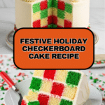 This festive Holiday Checkerboard Cake features four colorful cake layers in red, white, and two shades of green, arranged in concentric rings to create a stunning checkerboard pattern when sliced. The cake is made with moist white cake layers enhanced with sour cream for richness and layered with a creamy vanilla buttercream frosting. Perfect for holiday celebrations, this visually impressive cake brings a fun and delicious centerpiece to your dessert table.