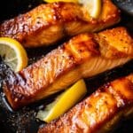 - Glaze and Serve: Flip the salmon once more, spoon the thickened sauce over each piece, and squeeze fresh lemon juice on top. Serve immediately to enjoy the crispy skin and glossy honey glaze.