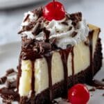 This decadent Hot Fudge Sundae Brownie Cheesecake combines a rich, fudgy brownie base with a creamy cheesecake layer, topped with warm hot fudge, whipped cream, shaved chocolate, and maraschino cherries to create a delightful sundae-inspired dessert perfect for any occasion.