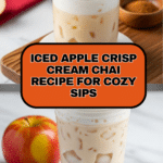 A refreshing and indulgent iced chai latte topped with a luscious apple crisp cream, combining the warm spices of chai with the sweet notes of apple brown sugar syrup and creamy whipped topping for a perfect fall-inspired treat.