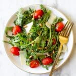 A white plate sits on a white marbled surface, holding a fresh salad with three main layers: the base layer of dark green arugula leaves with a slightly shiny, wet texture, scattered thin light-yellow cheese slices throughout the middle, and bright red grape tomatoes positioned mostly on top. Small tan pine nuts are sprinkled evenly over the salad. A gold fork rests partly on the plate, its handle detailed with vintage patterns, pointing towards the upper right. The whole scene is brightly lit, showing fresh and vibrant colors photo taken with an iphone --ar 4:5 --v 7