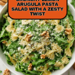 A refreshing Lemon Arugula Pasta Salad featuring tender pasta tossed in a zesty lemon and white balsamic dressing, combined with peppery arugula, crunchy walnuts, and fresh Parmesan. This vibrant salad balances tangy, salty, and nutty flavors, perfect for a light lunch or side dish.