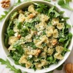 A refreshing Lemon Arugula Pasta Salad featuring tender pasta tossed in a zesty lemon and white balsamic dressing, combined with peppery arugula, crunchy walnuts, and fresh Parmesan. This vibrant salad balances tangy, salty, and nutty flavors, perfect for a light lunch or side dish.