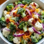 This Loaded Broccoli Salad is a vibrant, crunchy side dish featuring fresh broccoli and cauliflower florets tossed with a creamy, tangy Greek yogurt and mayonnaise dressing. Enhanced with crispy bacon, Colby Jack cheese, and red onion, this salad delivers a perfect balance of flavors and textures, making it a delicious addition to any meal.