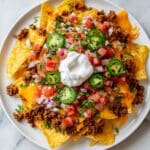 Keywords: loaded nachos, beef nachos, cheese nachos, taco nachos, party snacks, appetizer recipe, Mexican nachos