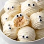 Mummy Oreo Balls are a fun and festive no-bake Halloween treat made from crushed Golden Oreos mixed with cream cheese, dipped in vanilla candy melts, and decorated with candy eyes to resemble mummies. They’re easy to make, creamy, and perfect for parties or a spooky snack.