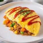 Omurice is a beloved Japanese comfort food that combines fluffy scrambled eggs wrapped around savory fried rice. This recipe features short-grain Japanese rice sautéed with onions and your choice of chicken, shrimp, or vegetables, seasoned with soy sauce and ketchup for a perfect umami-sweet balance. The soft omelet encasing the flavorful rice is finished with a drizzle of ketchup or demi-glace sauce, making it a delightful dish perfect for lunch or dinner.