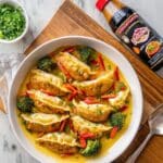 This One Pan Gyoza Curry Bake is a flavorful and hearty dish featuring vegetable or chicken gyoza cooked in a rich yellow curry sauce along with fresh vegetables like carrots, broccoli, and red bell pepper. Finished in the oven for a perfectly tender and lightly browned result, this recipe blends Asian-inspired flavors with comforting curry spices all in one easy skillet meal.