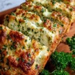 The image shows a close-up of a golden-brown loaf of garlic bread with an uneven top layer that is crispy and bubbling with melted cheese. The bread is sliced partially, showing multiple layers of soft, white inside with green herbs and creamy cheese spread between each slice. The top is sprinkled with finely chopped green parsley and has a crunchy texture with browned spots. The bread sits on a wooden board with a small bunch of fresh parsley nearby. The background has a white marbled texture. photo taken with an iphone --ar 4:5 --v 7