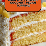 Keywords: pineapple cake, yellow cake, cream cheese frosting, tropical dessert, pineapple dessert, coconut cake, pecan topping