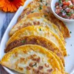 - Cook the tacos: Heat a large pan over medium heat and lightly grease with cooking spray or oil. Place the folded tacos in the pan, cheese side down, to help melt the cheese faster. Cook for about 4 to 5 minutes on each side until the tortillas are browned and crispy and the cheese is melted inside.