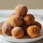 A white plate holds a pyramid-shaped pile of round doughnut holes, each about the size of a golf ball, with a rough texture coated evenly in cinnamon sugar. The doughnut holes are golden brown with a lightly grainy surface due to the sugar coating, and the pyramid has three visible layers: a base of five doughnut holes, a middle layer of three, and one balanced on top. The plate rests on a white marbled surface, and soft natural light highlights the sugary texture, making the doughnut holes look warm and fresh. photo taken with an iphone --ar 4:5 --v 7