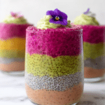 A vibrant and healthy Rainbow Chia Seed Breakfast Pudding made with layers of different flavored chia puddings including chocolate, mango, wheatgrass, avocado, and dragon fruit. Each pudding is naturally sweetened and packed with nutrients, making it a perfect colorful and wholesome start to your day.