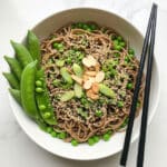 Keywords: Soba noodles, sesame dressing, tahini, edamame, snap peas, Asian noodle salad, vegetarian recipe, savory noodles