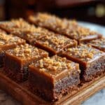 The image shows eight square pieces of cake arranged in two rows on a wooden board. Each piece has a dark brown, moist base layer with a rough texture. On top, there is a smooth, light brown caramel-like layer evenly spread over the cake base. The top is lightly sprinkled with small golden crunchy bits, adding texture and contrast. The wooden board is on a white marbled surface with a blurred warm background. photo taken with an iphone --ar 4:5 --v 7