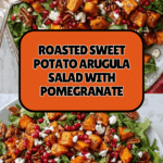 This Sweet Potato Arugula Salad features roasted sweet potatoes seasoned with smoked paprika paired with fresh arugula, crumbled goat cheese, crunchy pecans, and vibrant pomegranate seeds. Tossed with a sweet and tangy BRIANNAS Blush Wine Vinaigrette, this salad makes a deliciously balanced and colorful side dish or light meal that combines sweet, smoky, nutty, and fresh flavors.