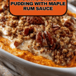 Keywords: sweet potato bread pudding, maple rum sauce, holiday dessert, baked bread pudding, autumn dessert, pecan bread pudding