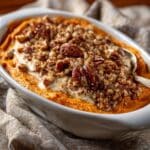 This Sweet Potato Bread Pudding with Maple Rum Sauce is a cozy and indulgent dessert that combines day-old French bread soaked in a rich custard made with sweet potato puree, warm spices, and chopped pecans. Baked until golden and served with a luscious maple rum sauce, it’s perfect for autumn or holiday gatherings. Topped optionally with vanilla ice cream or whipped cream, this comforting dessert offers layers of flavor and texture that will delight any crowd.