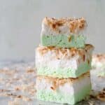14. Assemble the Final Layer: Gently spread the lime marshmallow mixture on top of the set coconut marshmallow layer. Immediately sprinkle the reserved toasted coconut shreds evenly over the top.