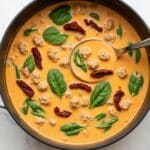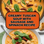 This hearty Tuscan Soup combines savory Italian sausage, crisp bacon, sun-dried tomatoes, and creamy spinach in a flavorful broth enriched with cannellini beans and cream. Perfect for a comforting meal, it’s a rustic, satisfying soup with rich textures and aromatic herbs.