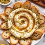 Keywords: whipped feta dip, feta and honey dip, Mediterranean appetizer, easy party dip, spicy honey feta, creamy feta spread, pistachio garnish, toasted baguette, savory dip